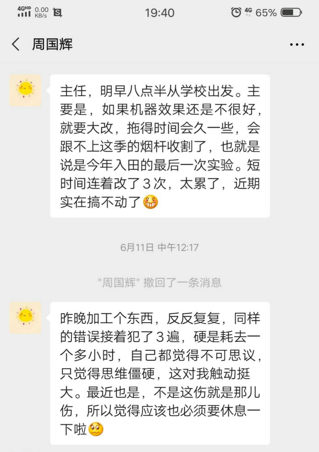 从烟杆收获机最后一次入田试验的前一天,周国辉发给学校某处室主任的信息中,可以感受到他一段以来所承受的压力和疲惫。特别烟叶采摘后,烟杆要及时清理,不可能为了他机器调试的需要留置田间太久,他不得不要加快工作进度。