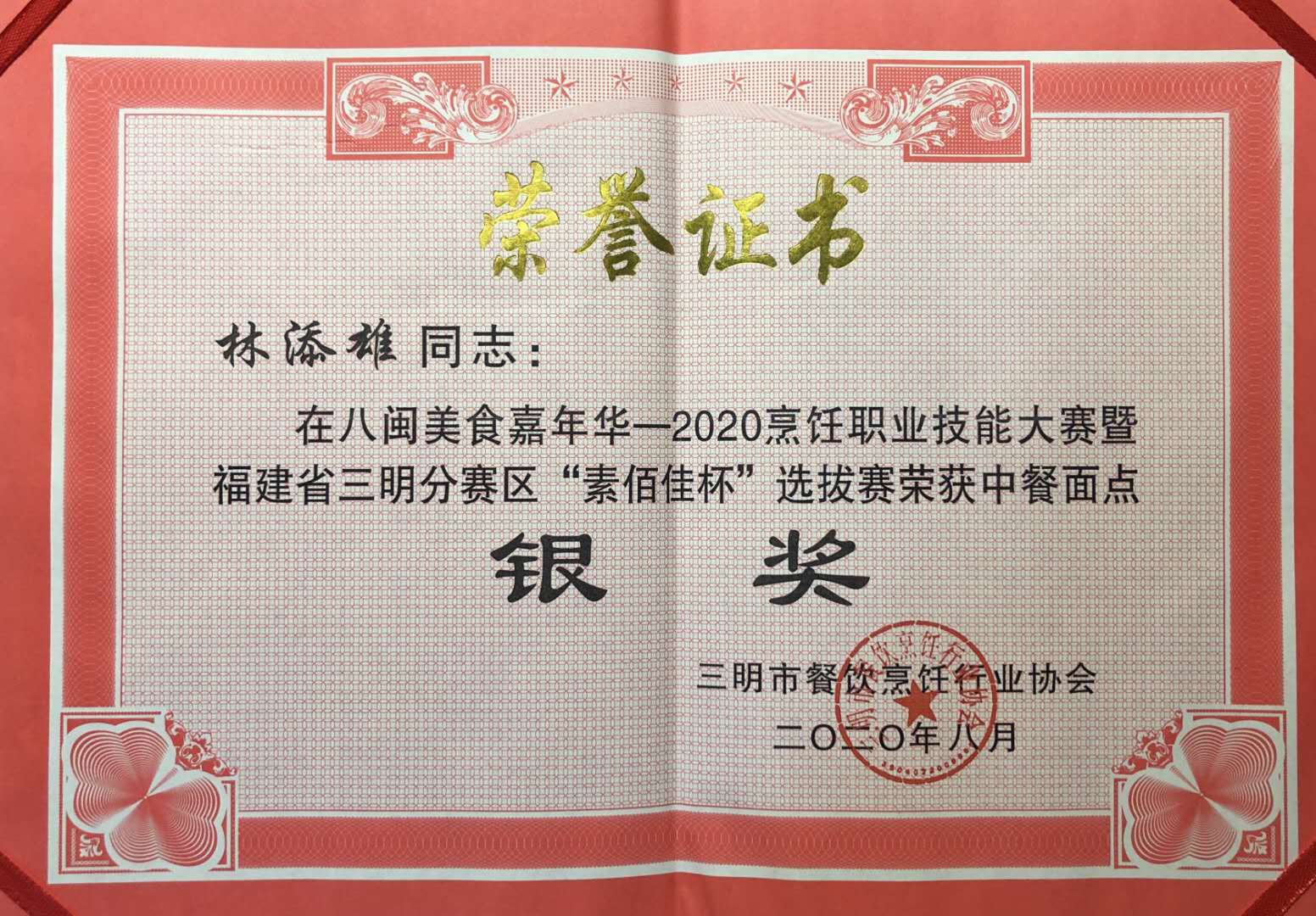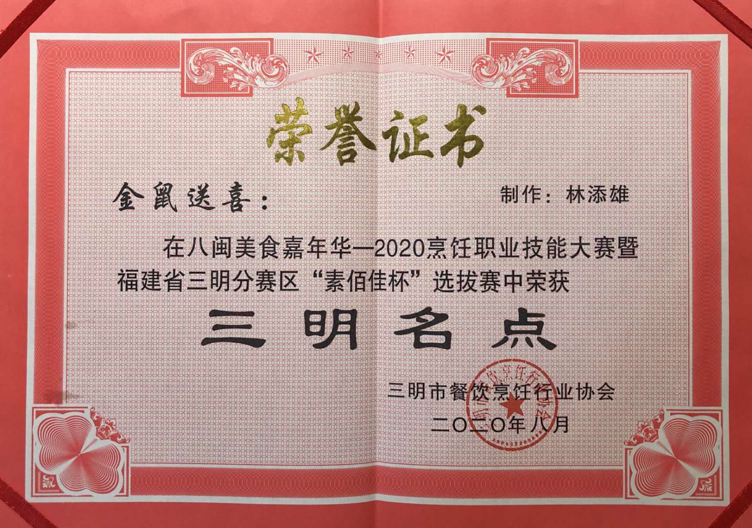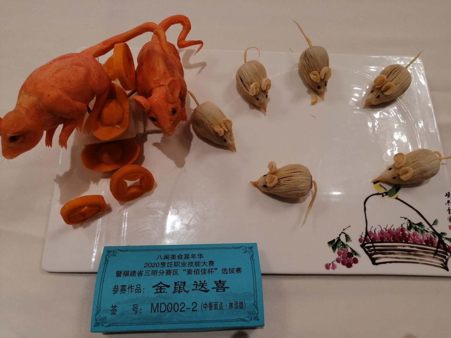 此次竞赛在倡导厉行节约,反对餐饮浪费的前提下,要求参赛选手以三明本地食材为原料,围绕大众化、民间化、实用化的特点进行创作。林添雄老师以“提褶包”和“金鼠送喜”两个精美面点作品荣获中餐面点组银奖,同时,“金鼠送喜”获评“三明名点”。