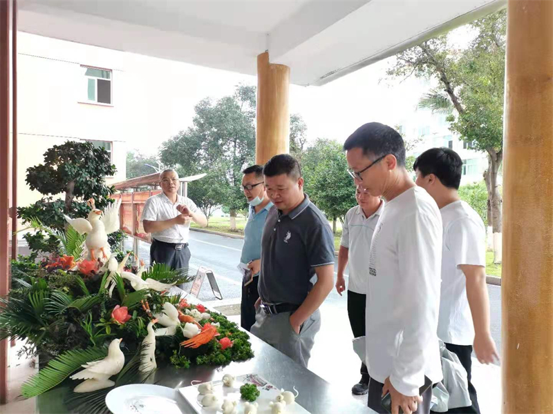 烹饪专业的学生分别展示了雕刻、热菜、面点制作以及画盘技术。其中,雕刻作品《孔雀迎宾》雍容大气,白萝卜摇身一变成为华丽孔雀与娇艳欲滴的花朵,胡萝卜雕刻成的小鸟在“绿草丛”中欢快鸣唱。热菜作品《花开富贵》虽已展示多时,依旧香气扑鼻。裹粉炸制的《菊花鸡脯》黄得似金,均匀的线条展示着学生们精湛的技艺和纯熟的刀功。面点油酥点心《鼠(数)你最棒》制作的栩栩如生,七只小老鼠活似乎就灵活现的在我们眼前活动。