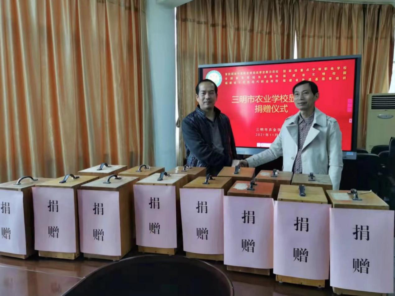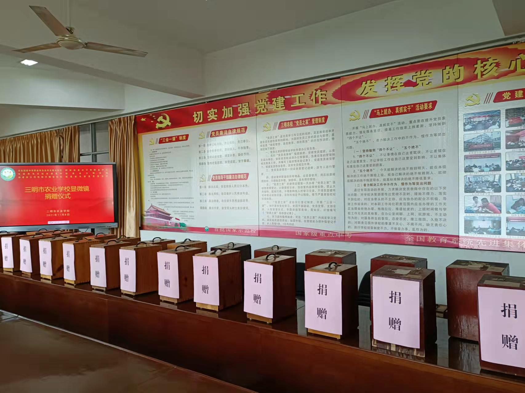 为支持乡村中学发展,促进乡村中学实践操作教学能力提高,以此发展乡村教育,助力乡村振兴。我校作为全省唯一全国乡村振兴人才培养优质中职院校,于2021年11月8日在校内举行显微镜捐赠仪式,向沙县郑湖中学捐赠显微镜25台,用于学生教学工作。三明市农业学校副校长黄书盛、教务处主任郑君强、郑湖中学教师代表出席捐赠仪式。